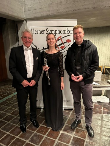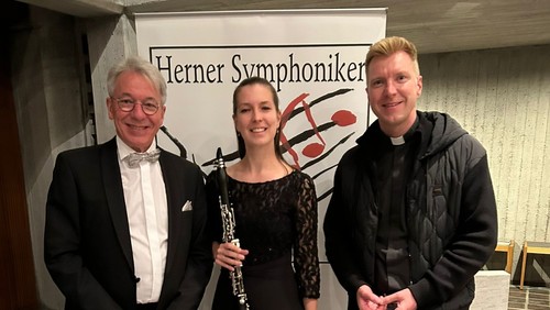 Die gefeierte Solistin an der Klarinette war die Herner Musikschullehrerin Lisa Marie Madreiter. Die Gesamtleitung lag in den bewährten Händen von Elmar Witt (l.). Bei beiden Künstlern bedankte sich der Pfarrer der St. Dionysius-Pfarrei Dr. Nils Petrat (r.) persönlich