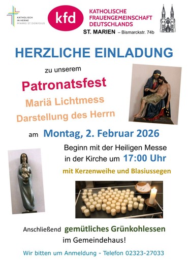 Herzliche Einladung zum kfd-Patronatsfest am Fest Mariä Lichtmess und Darstellung des Herrn am 2. Februar 2026: Heilige Messe mit Kerzenweihe und Blasiussegen um 17:00 Uhr in der Kirche St. Marien, anschließend Grünkohlessen im Gemeindehaus! Zur Essensplanung bitte anmelden 02323-27033