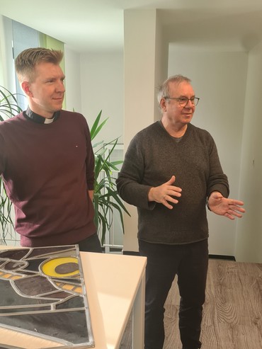 Auf der Durchreise von Köln nach Berlin schaute der beliebte Schauspieler am Samstag vor Weihnachten im Pfarrbüro der St. Dionysius-Gemeinde an der Glockenstraße vorbei, um die kleine Scheibe abzuholen. Und er nutzte die Gelegenheit, um zu erzählen, wie es zu dieser besonderen Beziehung zu einem Kirchenfenster mit Engel und Saxophon überhaupt kam.