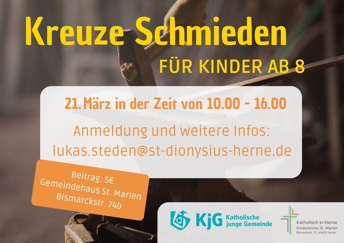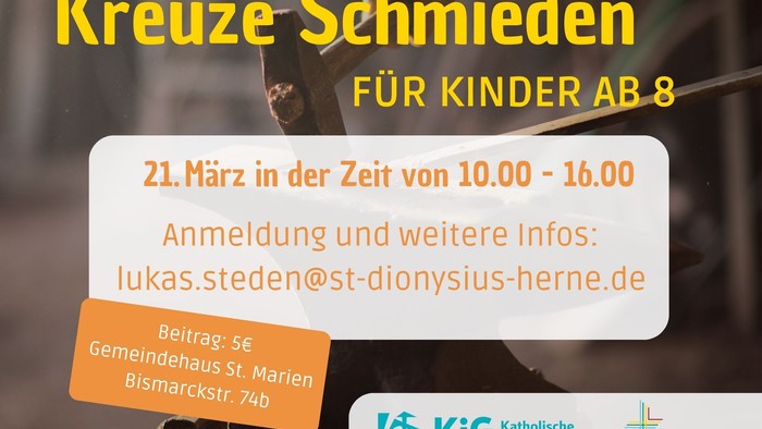 In diesem Jahr dürfen Kinder ab 8 Jahre wieder ein eigenes Kreuz schmieden. Die Aktion am 21. März dauert ca. eine halbe Stunde, die in der Zeit von 10.00 - 16.00 Uhr stattfindet. Anmeldung und weitere Infos bei: lukas.steden@st-dionysius-herne.de