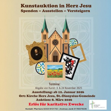 Den Höhepunkt bildet eine große öffentliche Kunstauktion am 8. März 2026 in der Herz Jesu Kirche. Hier kommen die Werke unter den Hammer – der Erlös unterstützt die sozialen und karitativen Projekte unserer Gemeinde.