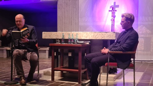 Robin Alexander steht für einen hintergründigen Journalismus ohne Geschrei und Panikmache. Er ist mit Ernst bei der Sache, kann allerdings zum Glück seinen Humor manchmal nicht zügeln, wie er beim Interview-Gespräch mit unserem Pfarrer Dr. Nils Petrat in der Bonifatius Kirche immer wieder bewies.