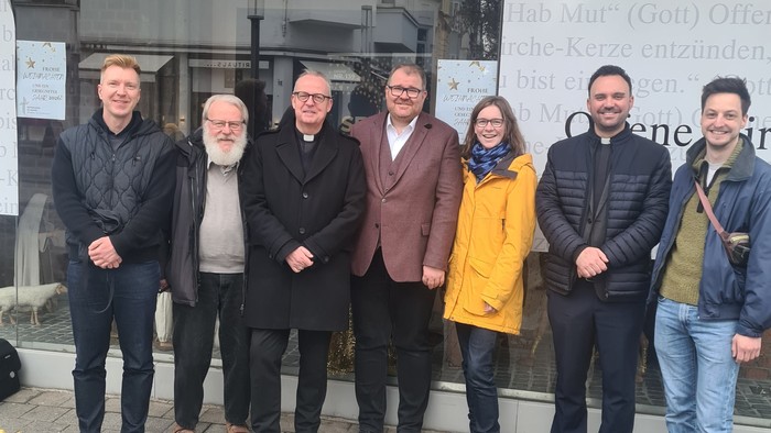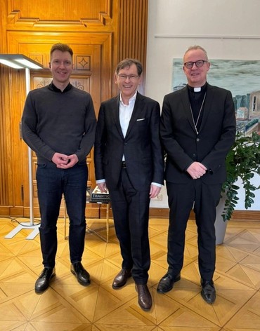 Bis April wird der Paderborner Weihbischof Josef Holtkotte zu verschiedenen Terminen und Veranstaltungen nach Herne im Rahmen einer Visitation im Dekanat Emschertal kommen. Sein erster Besuch führte ihn ins Pfarrbüro der St. Dionysius Pfarrei zu Gesprächen mit den Mitarbeitern des Pastoralteams. Ein gemeinsames Mittagessen und Einzelgespräche mit den Gemeindereferentinnen und -referenten gehörte zum Programm des ersten Tages sowie auch eine kleine Stadtführung durch die Herner Innenstadt und ein Besuch im Rathaus. Dort wurde Weihbischof Josef Holtkotte zusammen mit Pfarrer Dr. Nils Petrat vom Oberbürgermeister Dr. Frank Dudda empfangen, der dem Gast in einem Gespräch die Stadt und ihre Themen vorstellte.