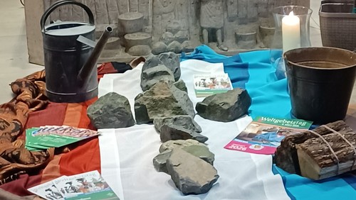 für jeden Besucher einen kleinen Stein als Geschenk und vor dem Altar ein großes Kreuz aus Steinen gelegt,